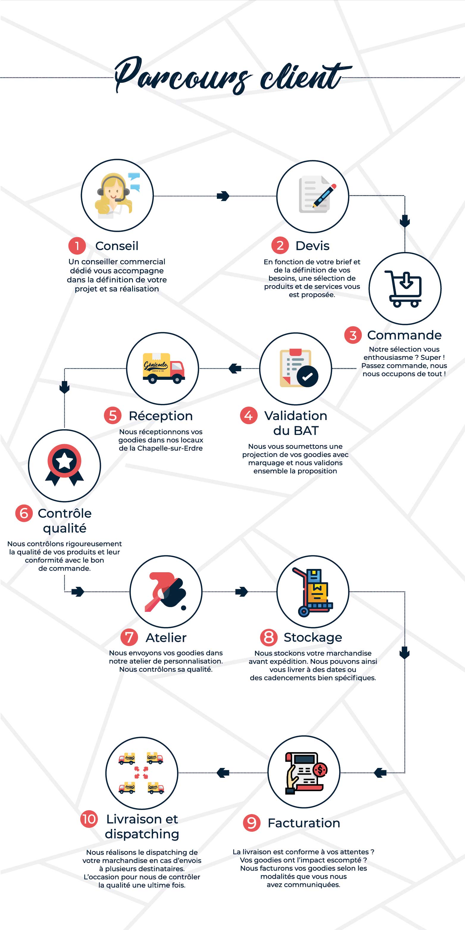 Découvrez grâce à notre infographie le parcours client chez Génicado. Un process synonyme d’accompagnement, de conseils et de qualité. Vous êtes déjà client ou vous vous apprêtez à passer commande ? Vous allez comprendre les étapes clés de votre projet et mieux nous connaître !