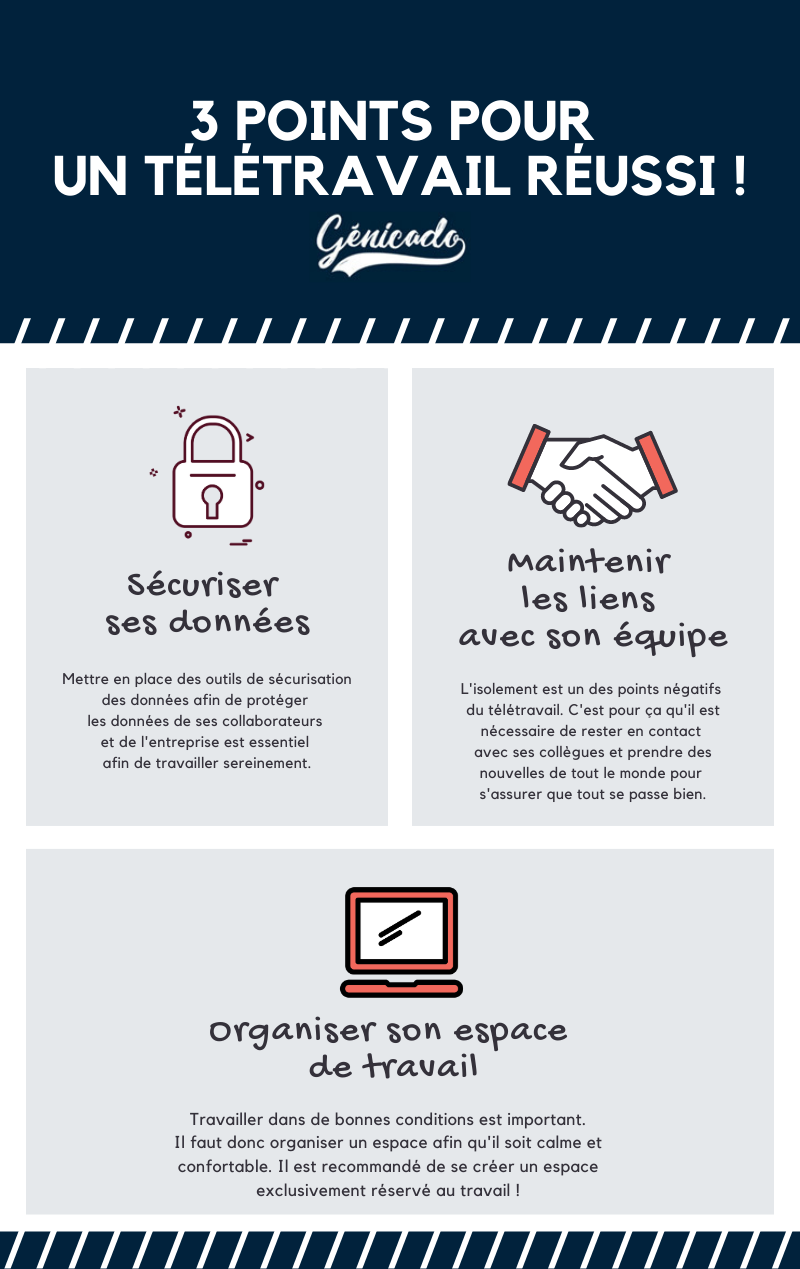 Chez Génicado, nous avons mis en place 3 grands fondements pour que tout se passe au mieux lorsqu’un employé à besoin de télétravailler :