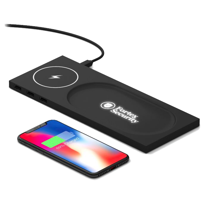 Idéal pour les petits espaces de travail comme chez moi, mais aussi pour charger son téléphone avec le chargeur à induction personnalisé et ses 3 ports USB ! On peut y déposer trombones, stylos… La touche finale : Lorsqu’il est branché, il offre un super rendu lumineux du logo !