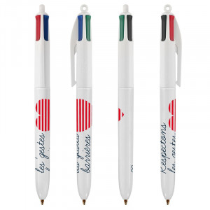 J’adore cette bouteille ! Sa capacité de 500ml est idéale pour l’utiliser toute la journée. En tant que bouteille isotherme personnalisée, elle permet de garder le chaud jusqu’à 5h et le froid jusqu’à 15h grâce à son vide d’air. L’impression en rond tout autour de la bouteille est top et on peut même faire un marquage nominatif pour que chacun ait le sien ! J’ajoute également un stylo 4 couleurs personnalisé de chez BIC car il est aussi possible d’en faire un marquage nominatif, parfait pour se reconnaître chez soi comme au bureau !