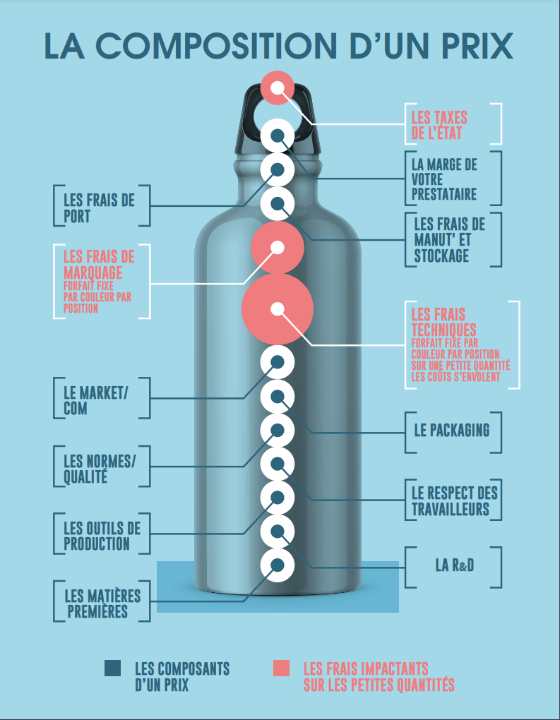 Dans l’objet et le textile promotionnel, un prix seul peut être attractif mais il n’est jamais la réalité. Le prix annoncé est souvent le prix du produit nu pour de grosses quantités, lisez bien le « à partir de ». C’est pourquoi vous devez faire appel à nos experts de la communication par l’objet pour vous assurer du prix final. Comme on le voit dans notre infographie, très souvent, les petites quantités souffrent de frais techniques et de taxes qui peuvent parfois multiplier le prix final par 5 ! Attention au prix, pensez budget global pour être mieux conseillé !